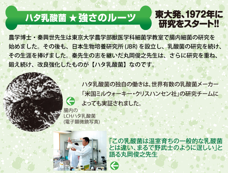 ハタ乳酸菌は、従来の乳酸菌製品とは違い、生きて腸に届き長く留まる力があります。