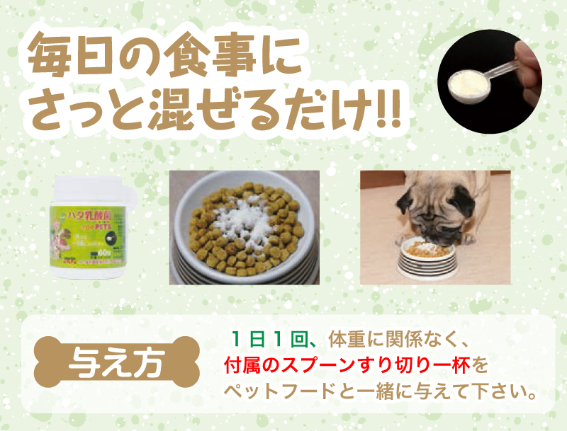 1日1回、 体重に関係なく付属のスプーンすり切り一杯をペットフードと一緒に与えてください。